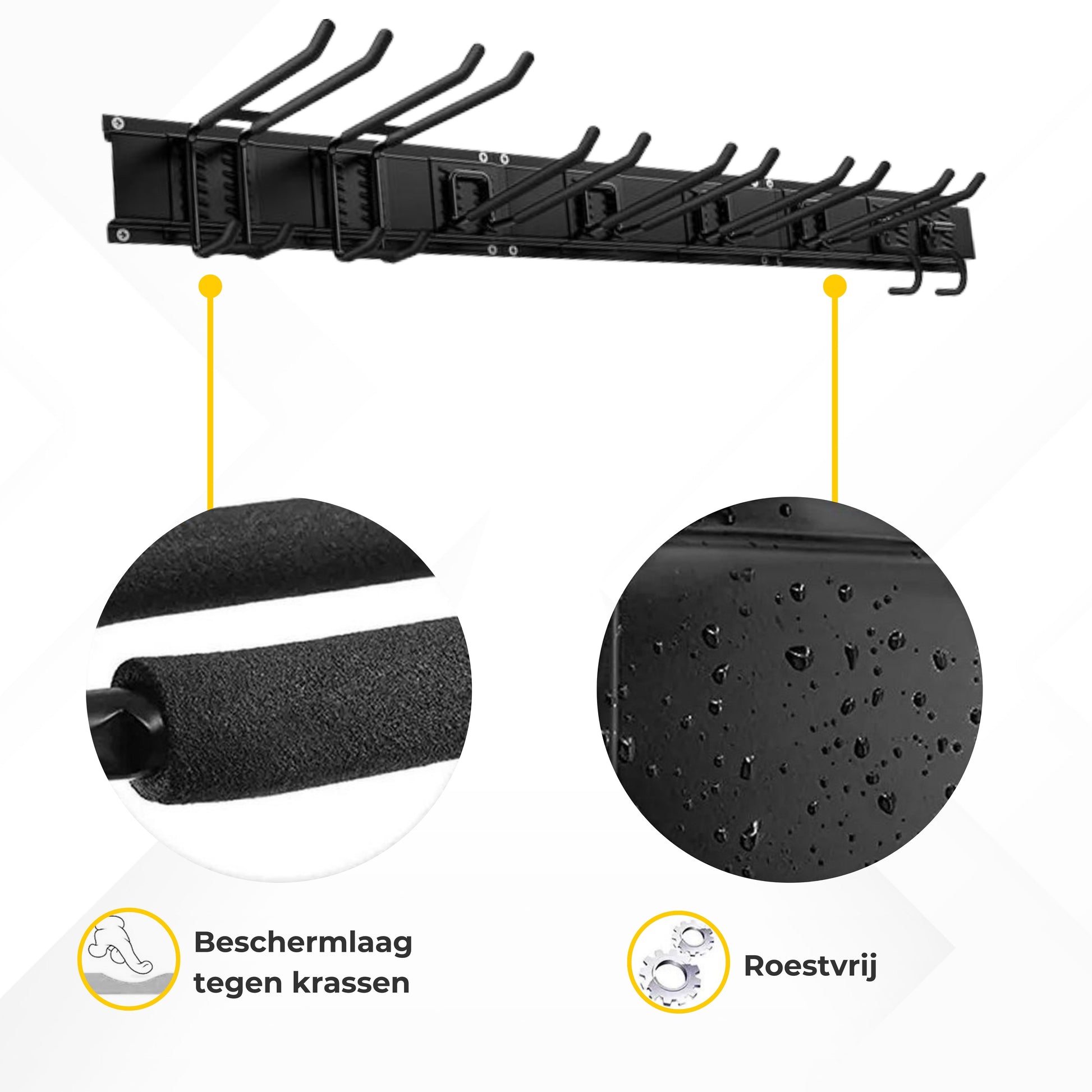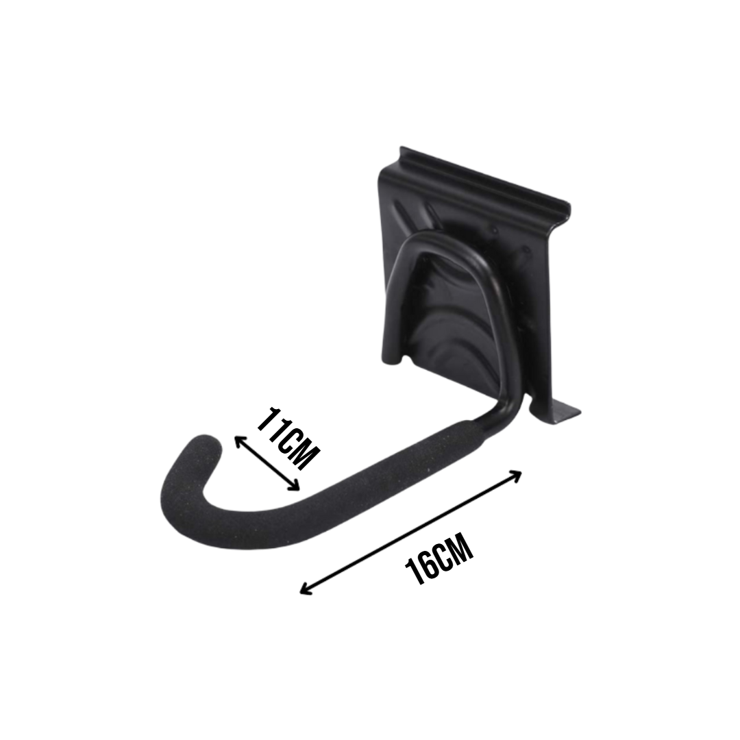 De basisrail kan bevestigd worden op een plaats of ruimte naar keuze. De twee fietshaken kunnen worden gebruikt voor alle volwassen fietsen of kinderfietsen en de twee accessoire haken voor allerhande accessoires, zoals fietshelmen en fluohesjes. De rail is eenvoudig te monteren en de haken kan je zelf verdelen overheen de bevestigingsrail. Hiernaast zijn de fietshaken voorzien van een rubberen bescherming, zodat jouw fietsen niet beschadigd kunnen worden.